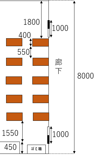 ・最後尾の机は後方に1550mm下げるとする。