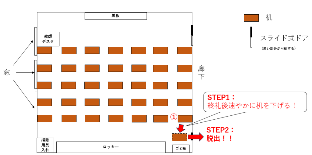 但し、以降の考察を進めるうえではいったん筆者の学校で実施していた終礼後に机を後ろに下げるという前提で終礼後の教室からの脱出について考察を進める。