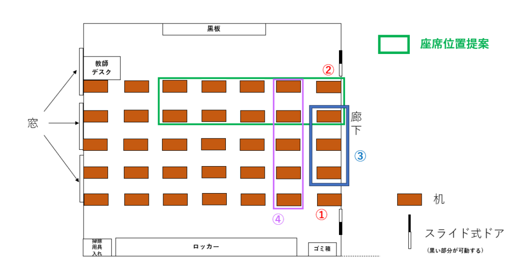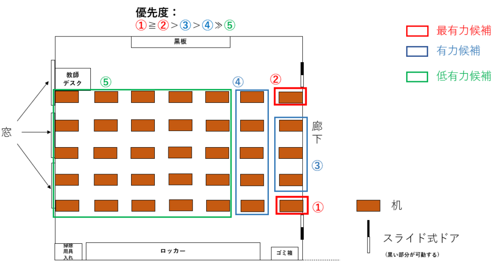 前章でも少し触れたが、ドア付近の座席位置①,②を提案しているのは、最も早い時間で教室から脱出できるからである。