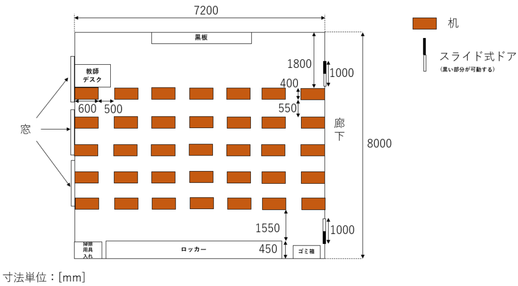 今回図3で示した教室の広さは上記の標準から若干異なっているが、机のレイアウトという面では大きく変わらないため、読者の皆様の帰宅検討をするうえではあまり大きな影響は受けないと考えている。(座席位置とドアの位置がわかり、教室脱出までの計算ができれば問題ないと考えられるため。)