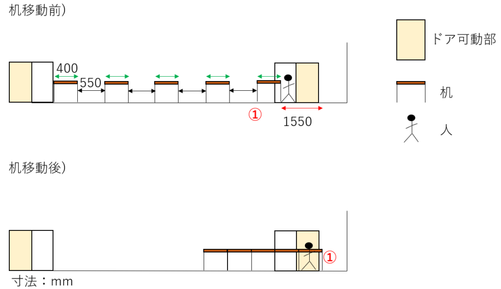 上図6-3より、①の座席位置の人は机を後方に1550mm移動後、ドアを出るだけ。