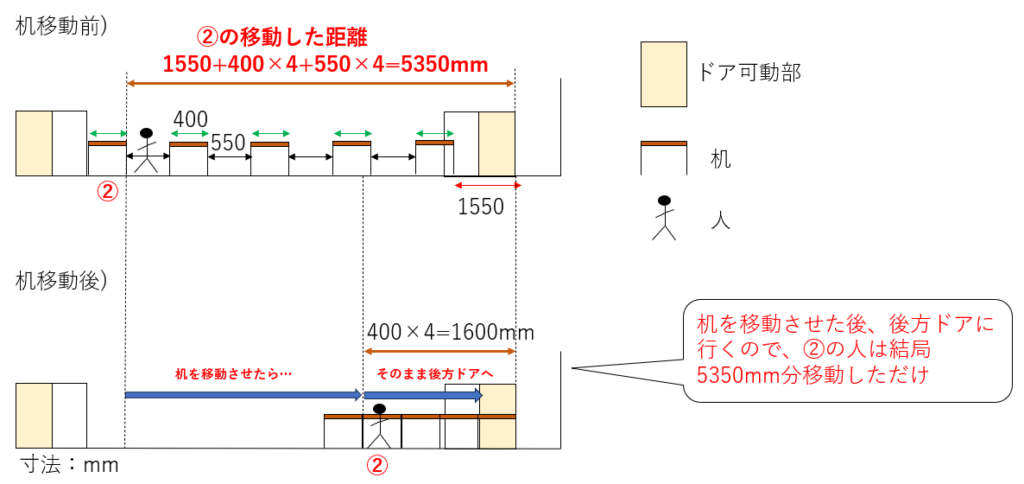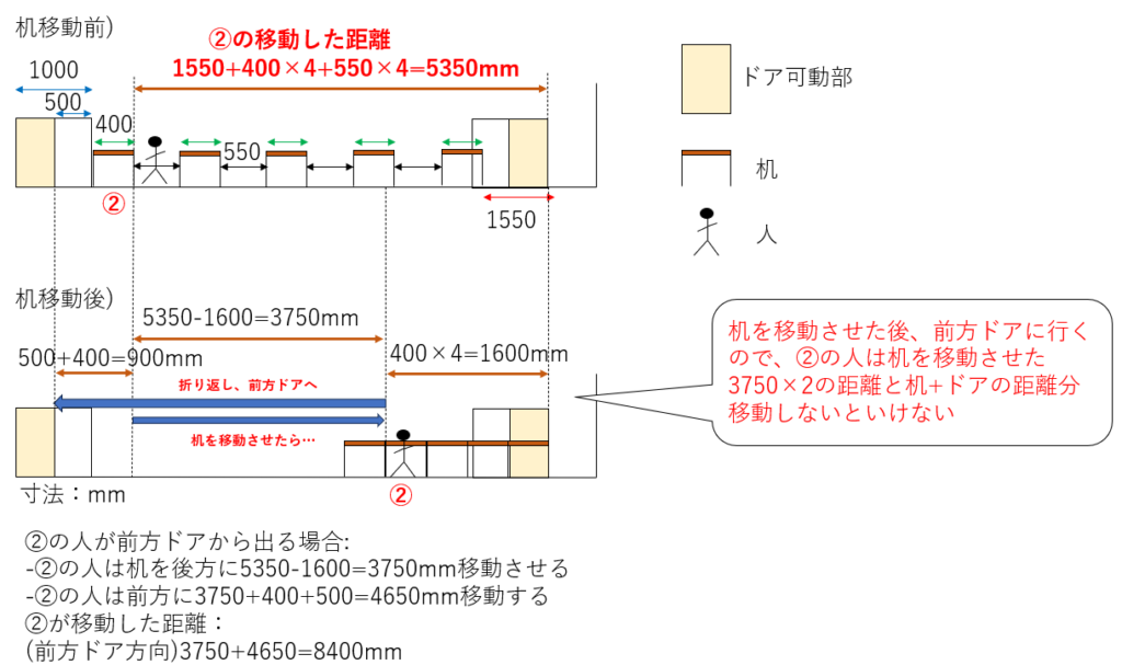 これは少し複雑だ。②の人の動きに着目すると、最初に机を後方に3750mm下げる。その後、前方ドアに向かうので、元の机の位置までは戻らないといけない。さらにそこから机分の長さ400mmとドアの幅の半分(ドアの可動部に至るまでの距離=1000÷2=500mm)の距離をさらに移動する必要がある。