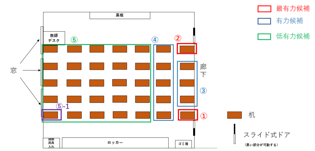 これはキツイ…特に窓際の人は教室からの脱出時間という観点を考慮すると⑤の人たちは①、②の人たちと比べて大きな時間ロスを抱えることになると考えられる。
