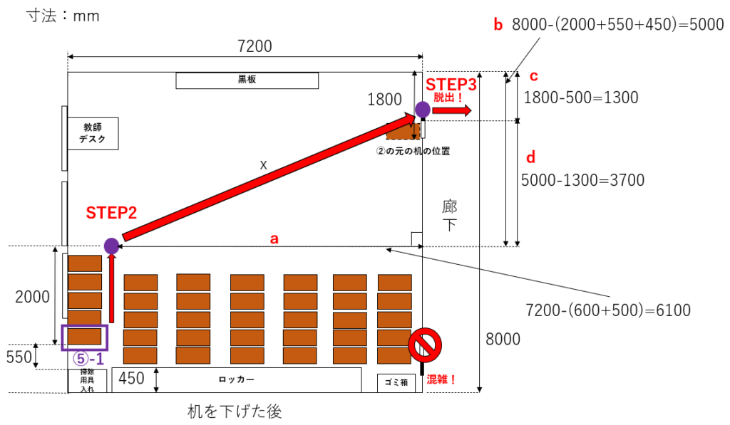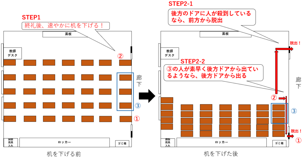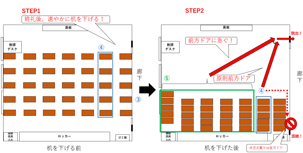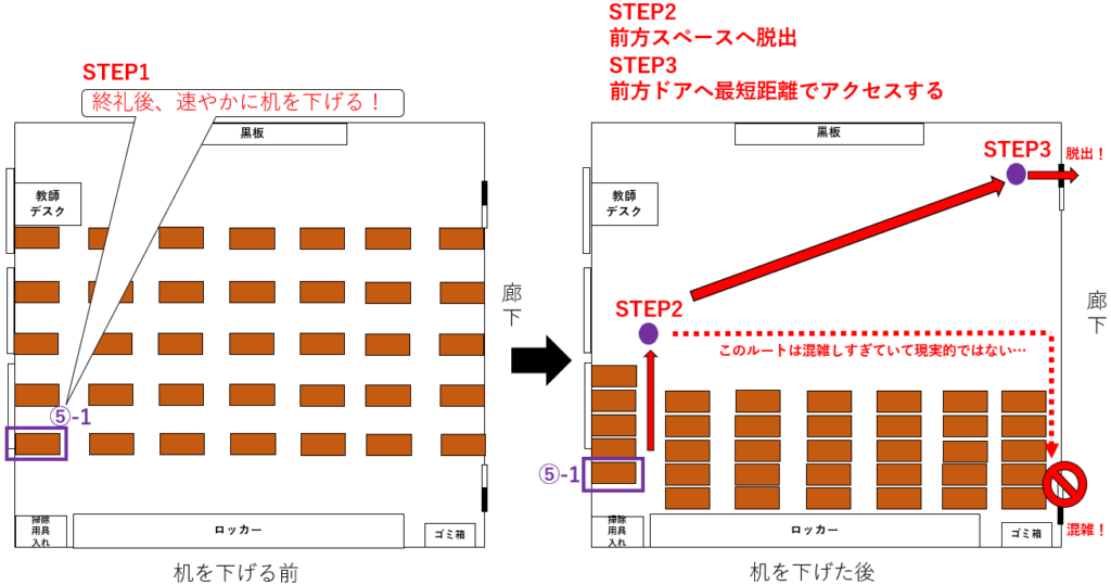 上図7-1の通り、⑤-1は机を下げた(STEP1)後、まず教室の前方スペースへ出る(STEP2)必要がある。この後は、他の生徒の動き次第ではあるものの、理想的には前方ドアへ最短距離で直進(STEP3)し、教室を脱出するという流れになる。